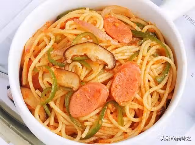 8、放入義大利面和蕃茄醬翻炒均勻即可。