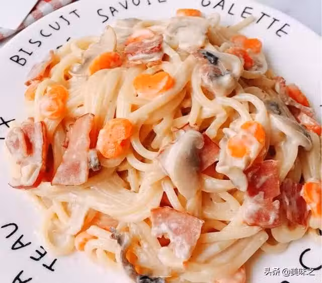意面適量、牛奶一盒、芝士1片、培根適量、胡蘿蔔適量、口蘑適量。