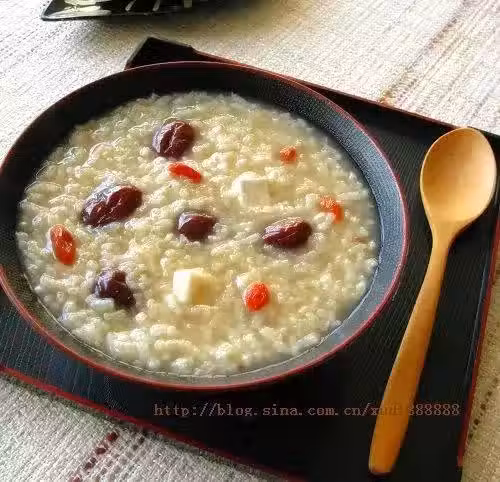 功效:健脾胃、益氣血、生津止渴 材 料:糯米 紅棗 茯苓 枸杞 做 法: 1. 糯米、紅棗分別淘洗乾淨,浸泡1-2小時; 2. 鍋中放入足夠的清水,大火燒開後下糯米、紅棗、茯苓,煮開後轉小火慢熬40分鐘; 3. 下枸杞繼續著5-10分鐘,喜甜的可以同時加入適量冰糖至融化即可。