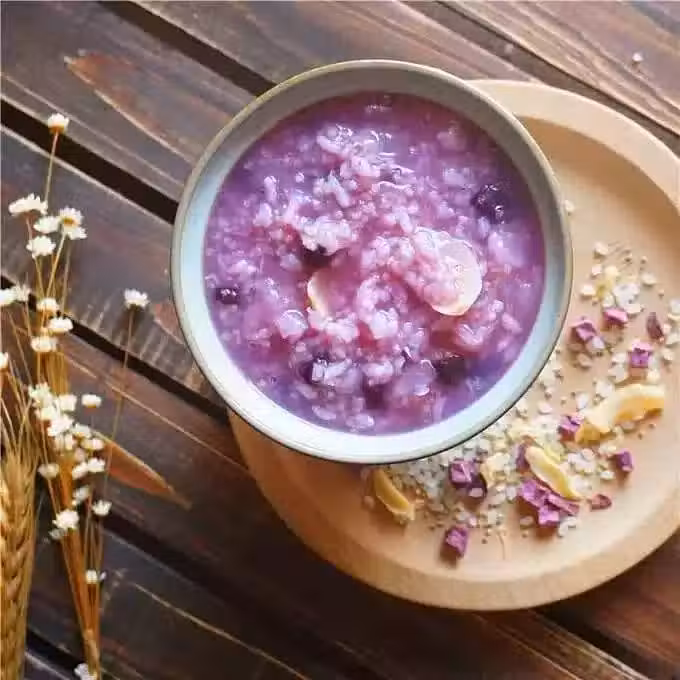 4. 將大米、銀耳、百合一同放入鍋中,加入開水,待熬制 7 分熟後,加入紫薯;