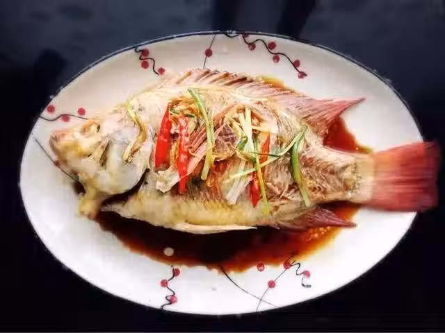 紅魚去內臟,洗凈後放大盆內;青紅椒、蔥、姜各切絲待用;紅魚倒黃酒,把一部分蔥、薑絲放魚身上腌制20分鐘;腌制後,上鍋蒸製15分鐘;取出後,把湯汁倒掉,蔥姜拿掉;把青紅椒絲放在魚身上,把另部分蔥姜也放魚身上,倒入蒸魚豉油待用;中火,炒鍋倒底油,油開後,淋到魚身上,出香味即可。