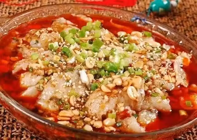 3.在大缽中放入鹽、味精、白糖、醬油、醋、炒過的姜蒜豆豉、紅油辣椒、花椒油、香油、油炸花生仁攪拌均勻兌成調味汁。