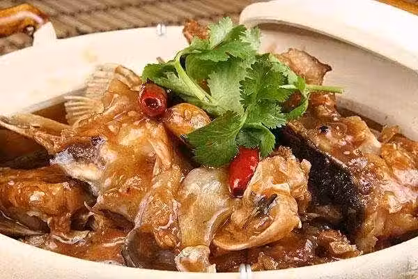 3、把魚頭放入砂鍋中,倒入大約一茶勺的魚露。如果沒有魚露可以放入半茶勺的雞精。主要起到增鮮調味的作用。
