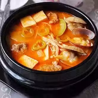 用料:牛腱子、西葫蘆、土豆、綠豆芽、柿子椒、洋蔥、金針菇、蛤蜊、色拉油、大蒜、辣椒醬、淘米水、韓國大醬