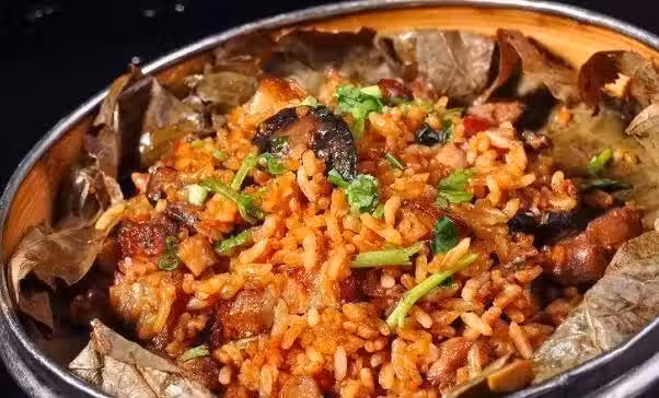 5、加少許熱水燜十幾分鐘,至水干盛出,將蒸熟的糯米和炒好的雞塊拌勻