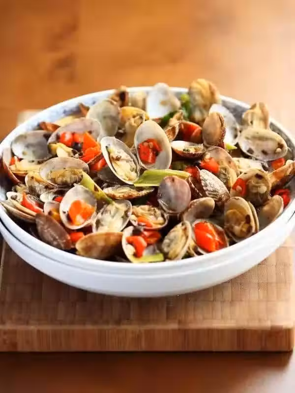 花蛤500g;紅尖椒30g;豆豉15g;姜2片;蒜蓉10g;大蔥40g;鹽2ml;白糖5ml;老抽3ml;雞精2ml;蚝油10ml;料酒5ml;食用油15ml