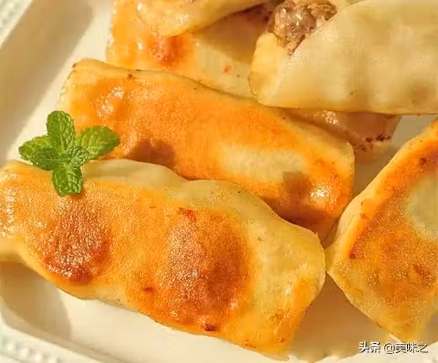 6、包入餡料,中間捏起來,平鍋燒熱底部抹油,放入鍋貼加蓋煎。