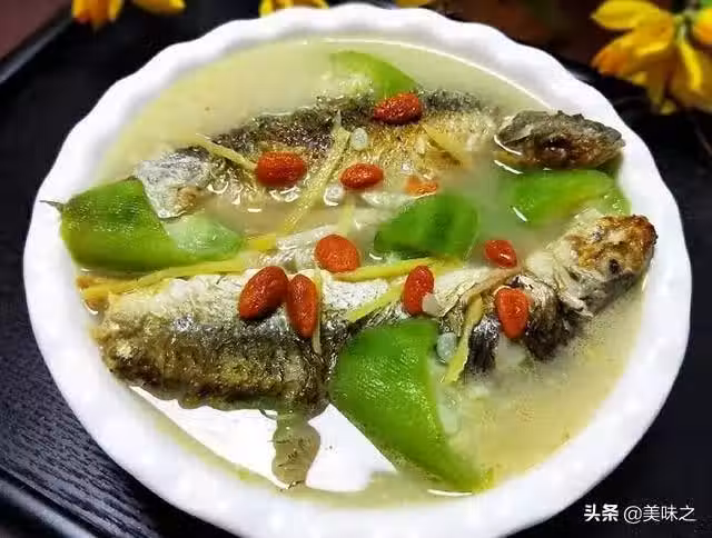 河魚2條、絲瓜一條、枸杞子20g、薑絲適量、鹽適量、雞精少許。