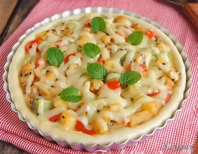 14、鋪上一層水果,在鋪上一層馬蘇,放入預熱好的烤箱,烤好後即可食用。