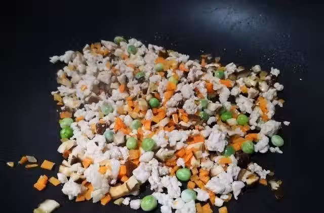 5、炒熟之後,倒入糯米飯,像炒飯一樣把它完全炒開,加入一勺老抽,一勺蚝油,一小勺鹽,再翻炒均勻,最後撒一點蔥花。