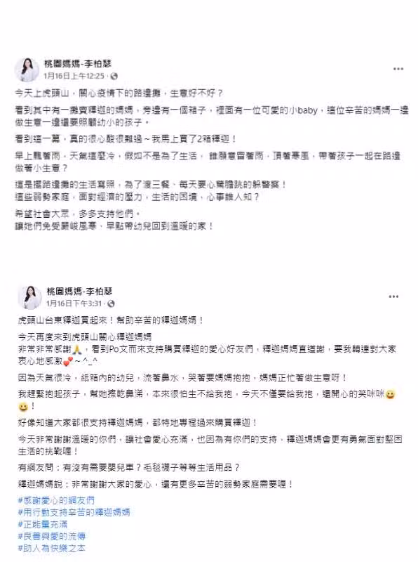 網友紛紛前來購買,讓女子十分感激。後來李柏瑟又跑了一趟公園,觀察到現場氣溫偏低,紙箱內幼兒一面流著鼻水,一邊哭說要「媽媽抱抱」,無奈母親正忙著做生意。見到眾人支持,李柏瑟感動地說,大家的愛心令釋迦媽媽更有勇氣面對堅困生活。