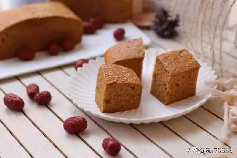 棗(干)50克、低筋麵粉150克、雞蛋4個、泡打粉5克、色拉油80克、食鹽3克、牛奶60克、紅糖120克、白糖30克