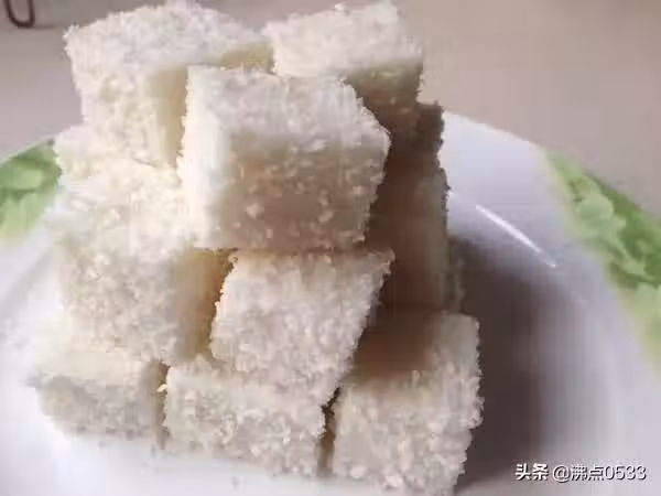 4、切成自己喜歡形狀以後,再裹上椰絲,就是漂亮的成品椰汁雪花糕啦