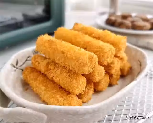 7、最後在一個平盤中放入一些麵包糠,將裹了蛋液的藍莓山藥條放進去滾一圈,裹上一層麵包糠。