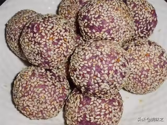 7、將炸好的麻團撈起,紫色的麻團看起來真漂亮。