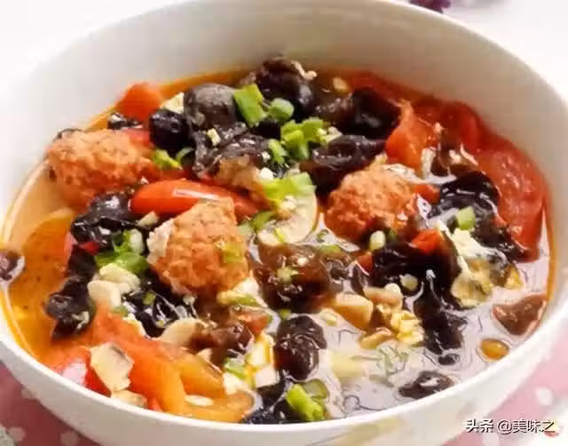 西紅柿、蘑菇、黑木耳、小肉圓、雞蛋、鹽、小蔥、大蒜、芝麻油。