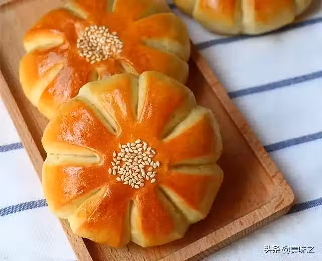 8、最後發酵完成後,刷全蛋液,用擀麵杖一頭沾水,再粘上白芝麻,點在麵糰中央,放入預熱好的烤箱,中層上下火,180度18分鐘。