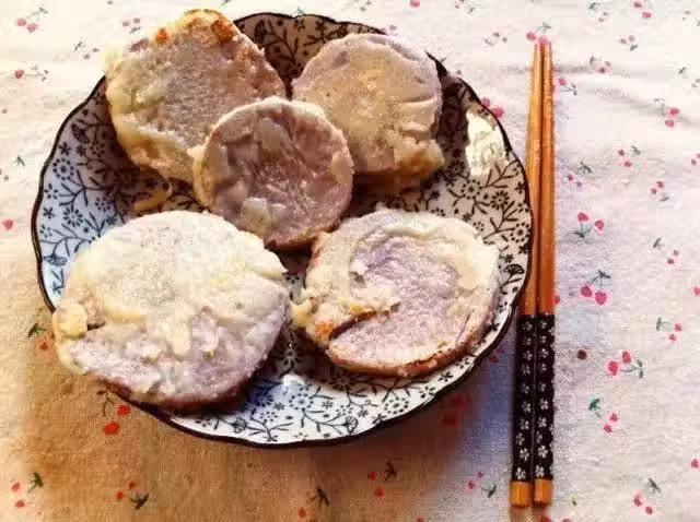 3. 再用麵粉加雞蛋做成的糊糊上一層放油里一炸,表面金黃裡面軟而略有鹹味,可口~
