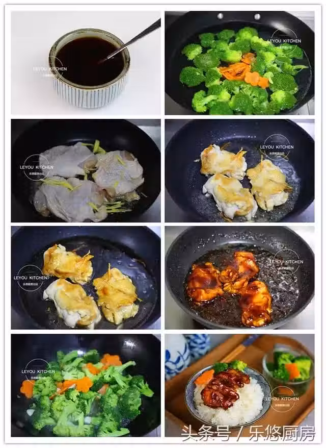 第十六步:盛一碗米飯,放上切好的照燒雞腿肉和蔬菜,淋一些照燒湯汁,即可開動了。