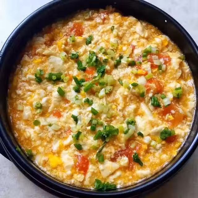 然後放水澱粉用鍋鏟推動豆腐,待湯汁粘稠,放入蔥花即可