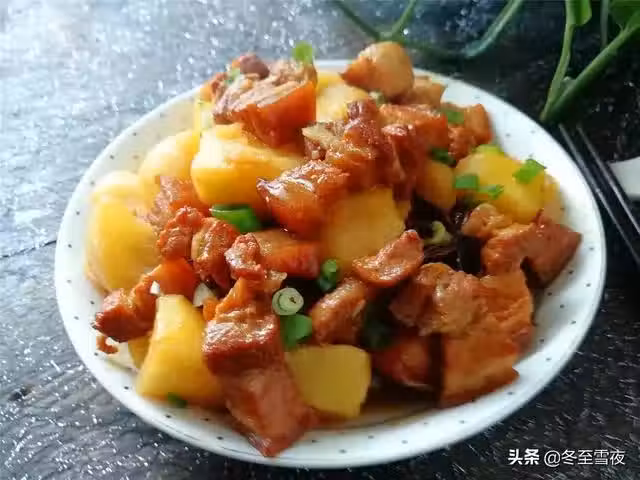 【豬肉燉土豆】所需材料:五花肉500克、土豆2-3個、油鹽適量、蔥1段、姜1塊、大蒜2瓣、冰糖1湯匙、花椒10-20粒、大料1個、生抽2湯匙、料酒1湯匙、干辣椒2個、