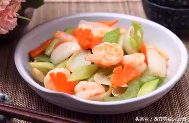 食材:西芹、百合、彩椒、蝦仁、雞蛋、澱粉、油、蔥、薑、鹽