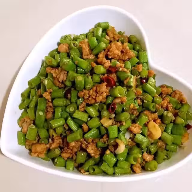 用料:長四季豆適量、瘦肉適量、肥肉適量、蒜蓉適量、辣椒粉適量、花椒油適量、雞精適量、老抽適量