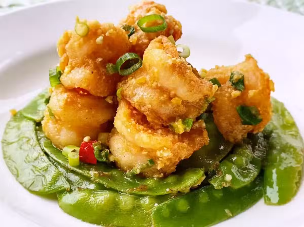 5.、再將蝦仁回鍋,快速翻炒到蝦球表面都包覆到鹹蛋黃,並撒下蔥花翻炒均勻即可上桌。
