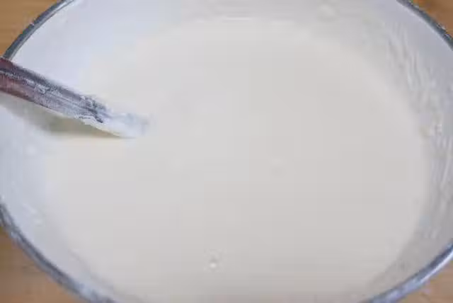 2.面盆中倒入2碗清水,一點點地加入麵粉攪拌均勻至無顆粒的麵糊。麵糊不要太稀。