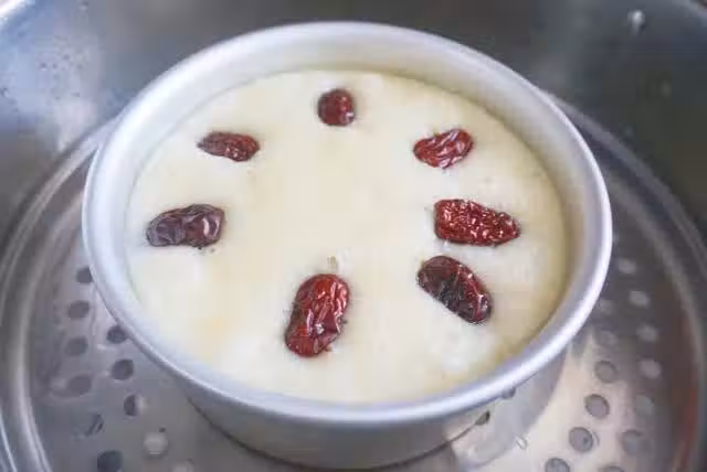 6.麵糊表面擺放上紅棗,放入蒸鍋中,大火上汽後,蒸30分鐘,燜2分鐘出鍋。