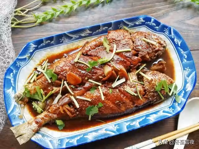 6.燒制剩少許湯汁時,關火,將黃花魚撈出,將剩餘的汁淋在黃花魚上,撒上香菜段即可。
