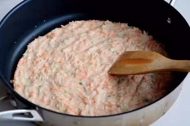 14、平底鍋不粘鍋預熱,倒入麵糊混合物攤平
