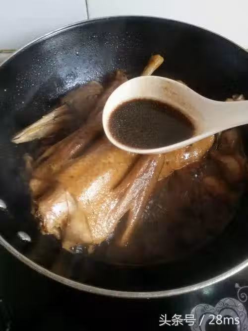 9. 燒幾分鐘要用勺把湯汁淋在鴨身,反覆做,等湯汁差不多了加白糖、喜歡辣的就加入辣椒,可以放入鴨肝了