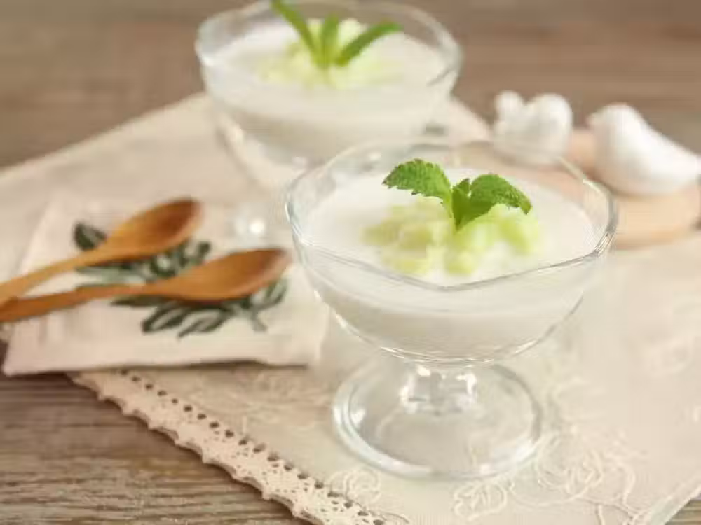 6 把蜜瓜泥,蜜瓜球及西米加入椰漿,冷卻後放入冰箱冷藏至少3小時即可。