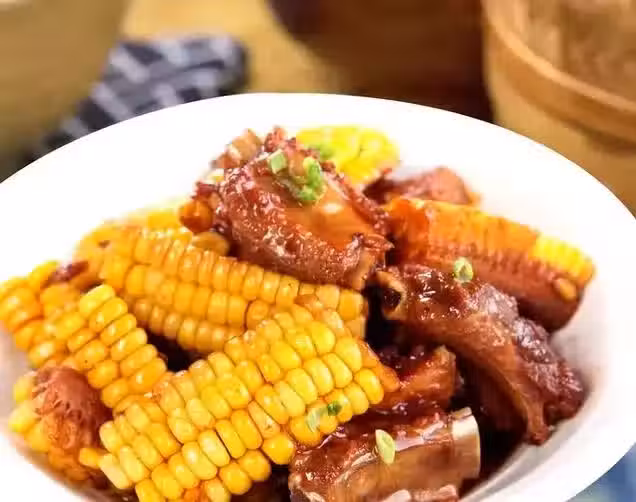 7.加入玉米段和花生米, 蓋上蓋, 再燉上十分鐘;