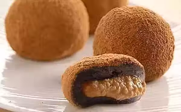 1、取一盆,放入糯米漿、樹薯粉、黑糖搓拌均勻,接著分等份揉捏成圓球形(每顆重約80公克),此即為黑糖麻糬。