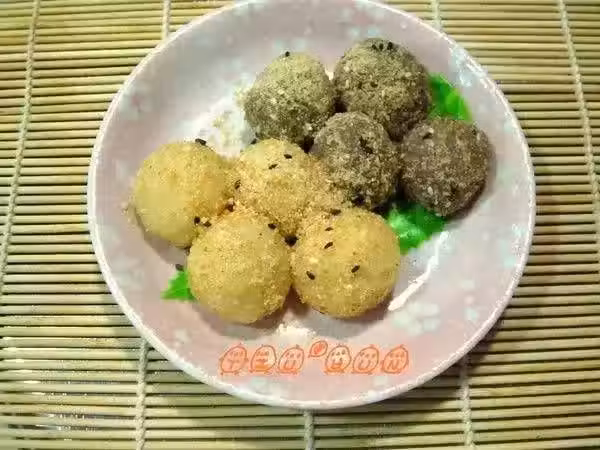 糯米粉140~145g、紫米粉5~10g、日本太白粉(或一般太白粉)1小匙、細砂糖1小匙、油1小匙、水150g、沾粉、黑白芝麻少許、熟花生粉適量、細砂糖或純糖粉適量
