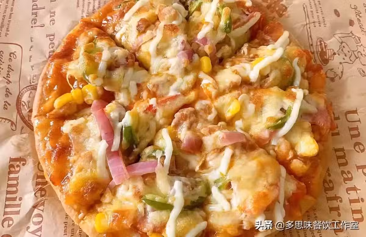 披薩餡料部分:培根兩片,雞腿一個,玉米粒適量,洋蔥適量,青紅辣椒適量,原制馬蘇里拉奶酪適量