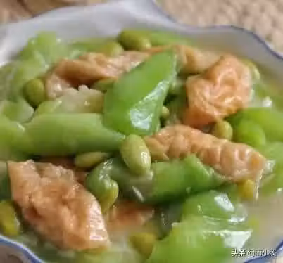 油鍋燒熱後,下絲瓜煸炒,可入少許水,絲瓜會出水,所以不要放多,然後下麵筋,兩者都軟後,放入毛豆,炒勻後加少許鹽即可,也可以勾個薄芡,我沒勾