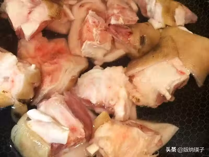 第一步:豬腳洗凈,刮毛,切塊,冷水入鍋,在鍋里出焯水後入盆,冷水洗凈,瀝干水。
