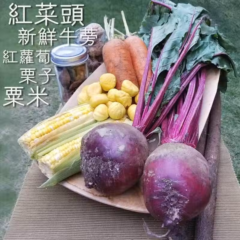 紅菜頭、牛蒡、紅蘿蔔、栗子、粟米配蜜棗、果皮、片糖