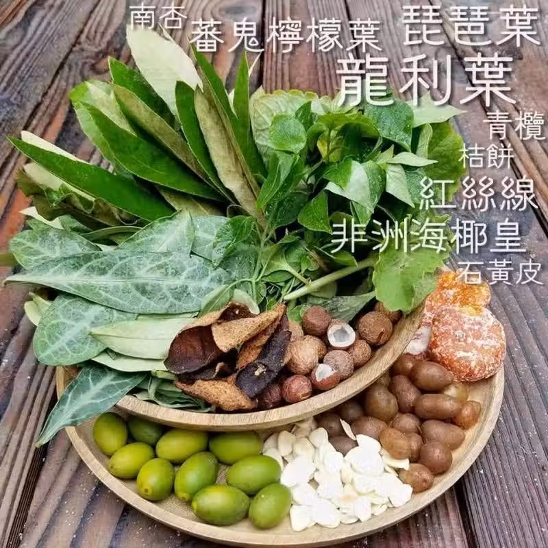 非洲海椰皇、龍脷葉、琵琶葉、紅絲線、蕃鬼檸檬葉、石黃皮、青欖、橘餅、南杏配果皮
