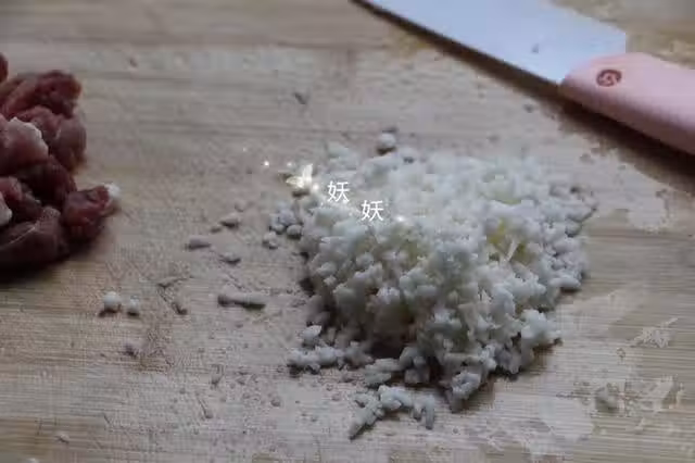 5,將豬肉塊加姜一起攪打成肉泥,加入荸薺,加鹽,少許料酒摔打上勁。