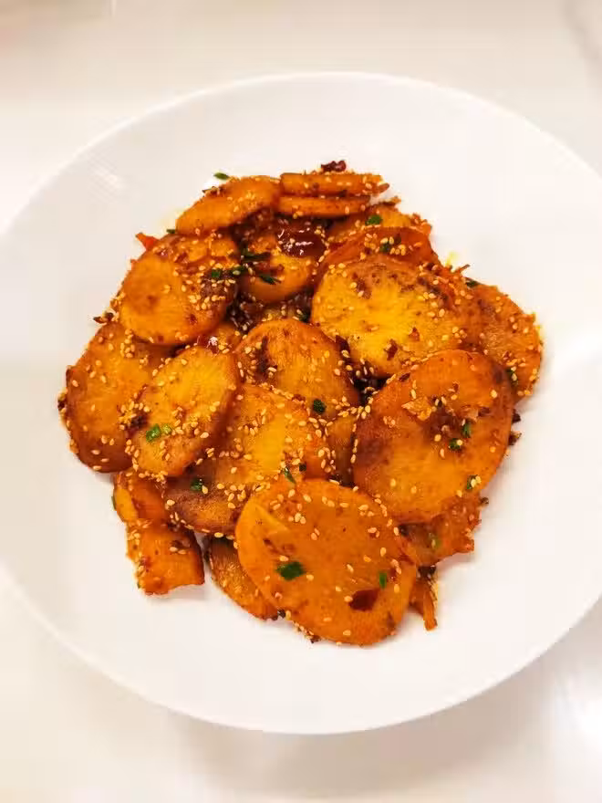 3. 煎好把土豆推開到鍋邊,加入蒜末、豆瓣醬炒出紅油,然後加入2勺生抽快速炒勻,出鍋撒蔥花,白芝麻就完成啦