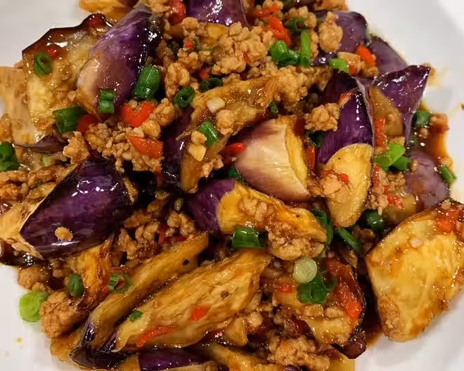 3. 鍋熱油放茄子炒軟,盛出備用,鍋留底油放蒜末爆香,再放一勺郫縣豆瓣醬