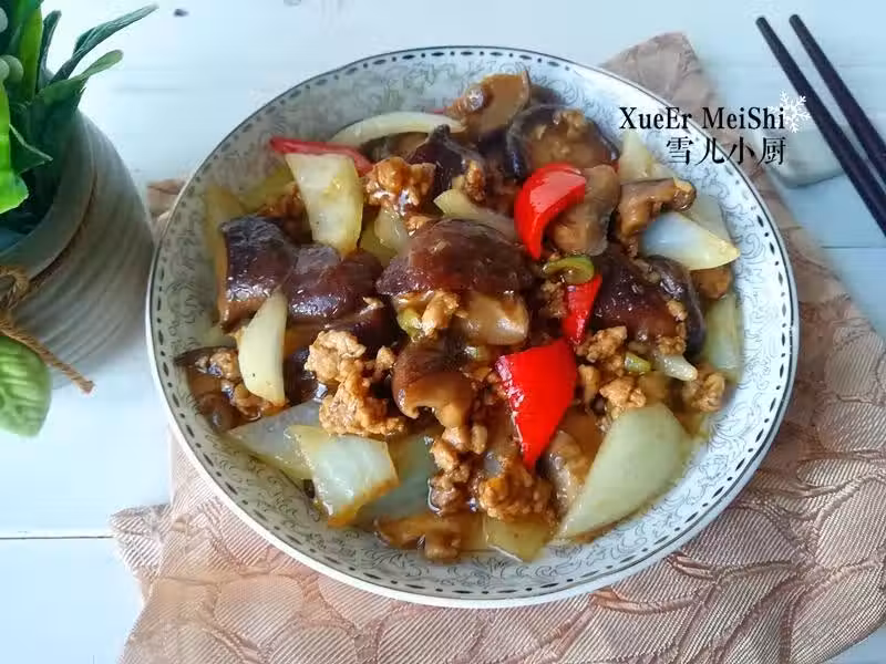 材料:香菇250克、洋蔥1/2個、紅椒1段、豬肉150克、蔥1段、姜5克、大蒜2瓣、料酒1湯匙、生抽醬油1湯匙、水澱粉適量