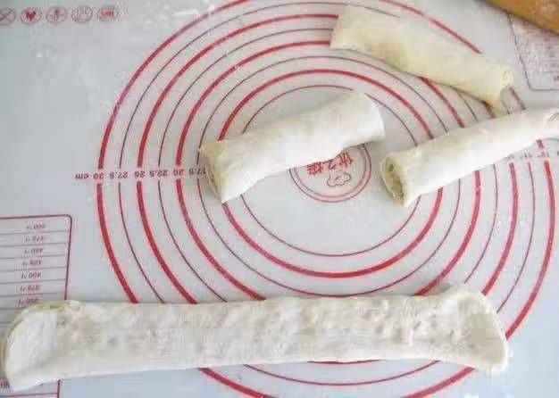 7、捲起後分紅10厘米長的小段,每一段先用手掌壓扁平,拉長