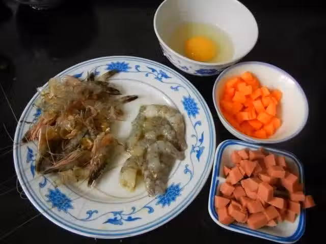 2.雞蛋打勻.胡蘿蔔與火腿腸切丁,鮮蝦去殼,挑去沙線洗凈.