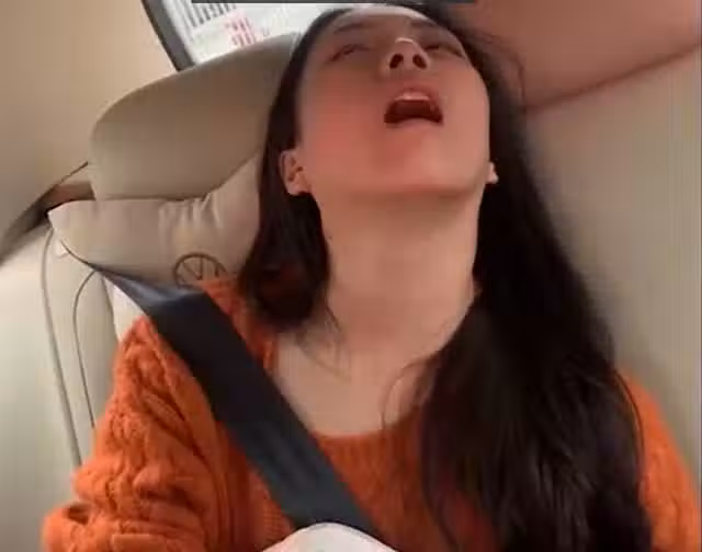 女子手上抱著女兒睡得正香,仰著腦袋、嘴巴張開、眼睛微微睜開,睡得很深沉,可能正在做美夢,也可能是該女子實在很累了,坐在車後座上睡得很死,沒了往日優雅的樣子。
