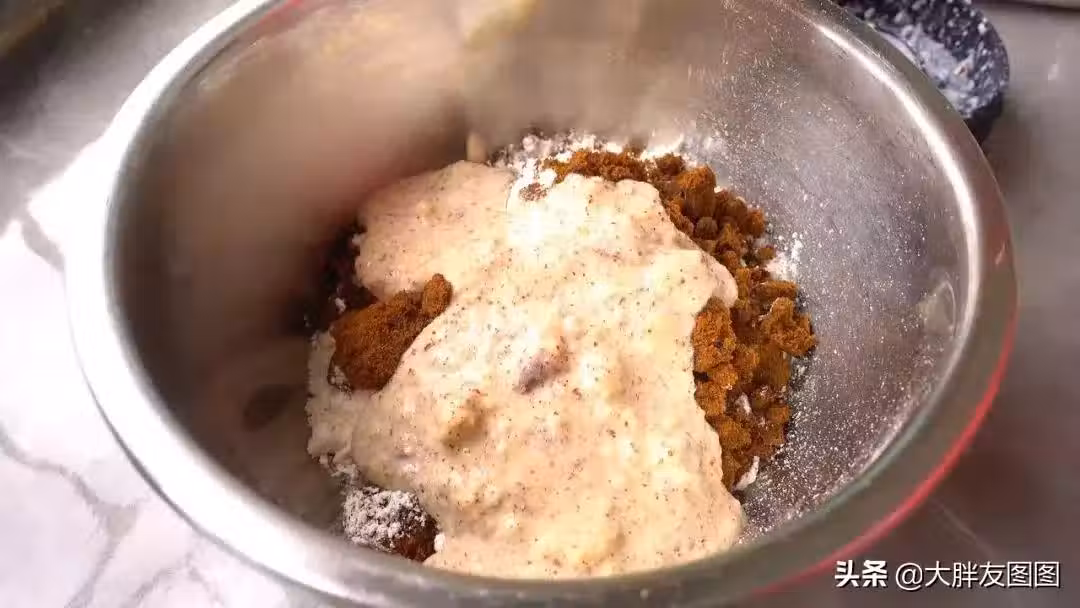 再倒入蛋液,拌均勻到看不見白色粉末,獲得一個粘稠的麵糊。看起來感官不太美味,沒關係,待會蒸起來就好吃了。
